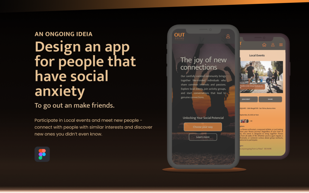 Born from a UX Challenge, outgoing takes on social anxiety, offering a supportive space for forging connections, fostering encouragement, and discovering customized social events to make meaningful friendships.
