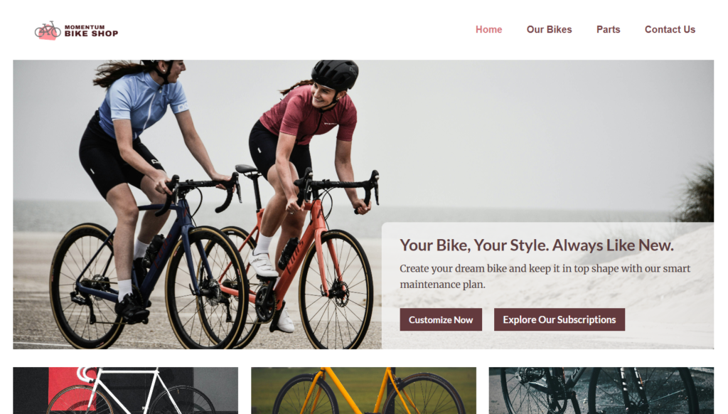 WEBFLOW: Built a fully responsive CMS-driven site in Webflow for a custom bike brand. Focused on clean layout, dynamic content, and smooth mobile experience. Strengthened skills in responsive design, CMS structuring, and breakpoint-specific styling.